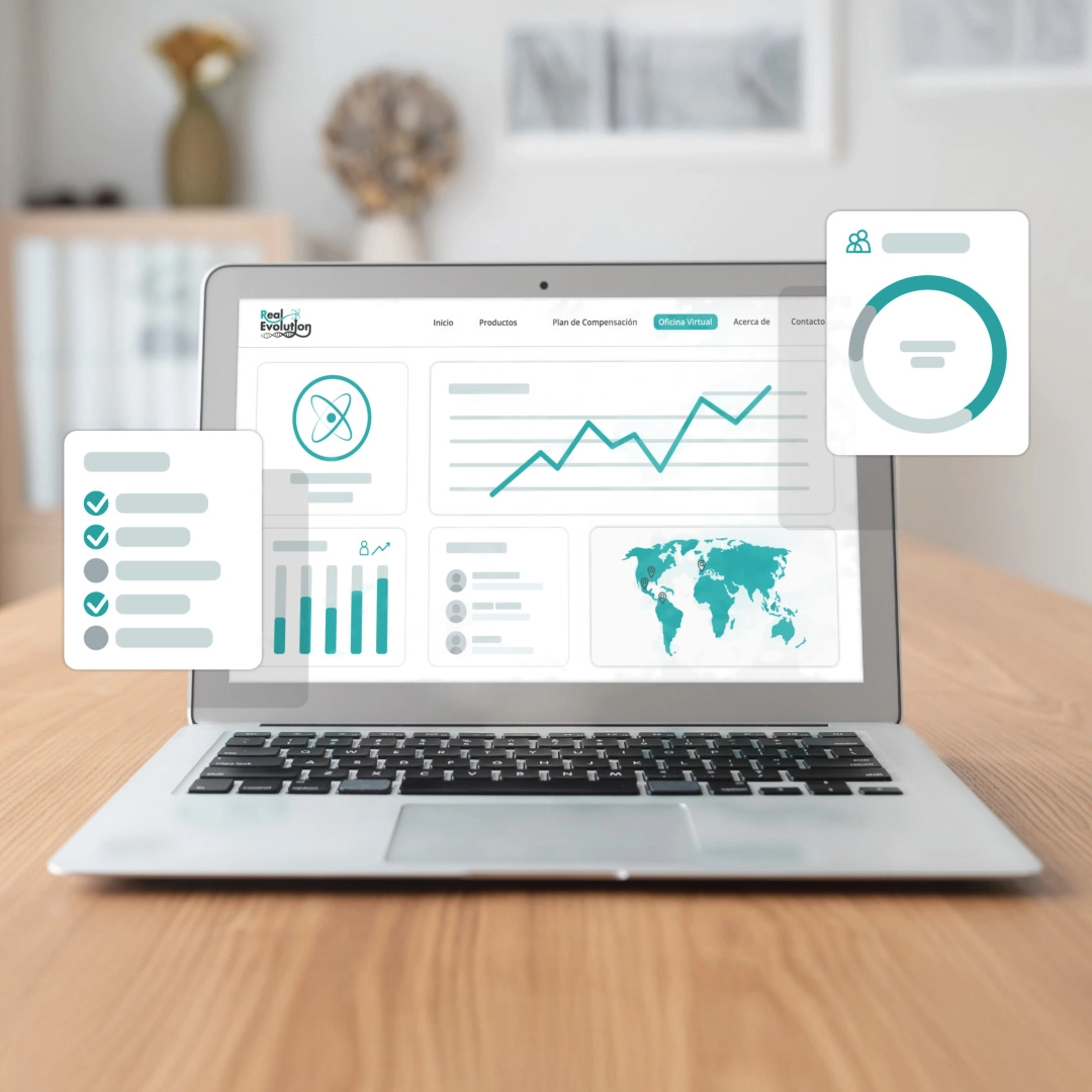 Accede a tu oficina virtual de Real Evolution y gestiona todo tu negocio de forma sencilla. Desde un mismo lugar podrás consultar tus regalías, hacer seguimiento a tu red de afiliados y revisar el estado de tus pagos. Una herramienta diseñada para que tengas siempre el control de tu crecimiento, con la información actualizada y al alcance de tu mano.