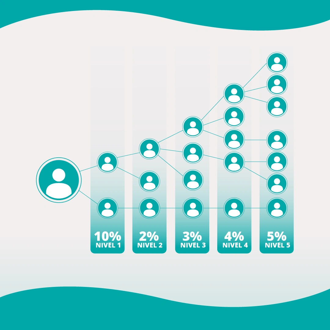 Con la compra de 2 productos al mes accedes a una regalía de 5 niveles: 10% sobre tus afiliados directos, 2% en tus afiliados de segundo nivel, 3% en tu tercer nivel, 4% en el cuarto y 5% en el quinto. Este escalón premia la constancia y te permite capitalizar mejor el crecimiento de tu organización.