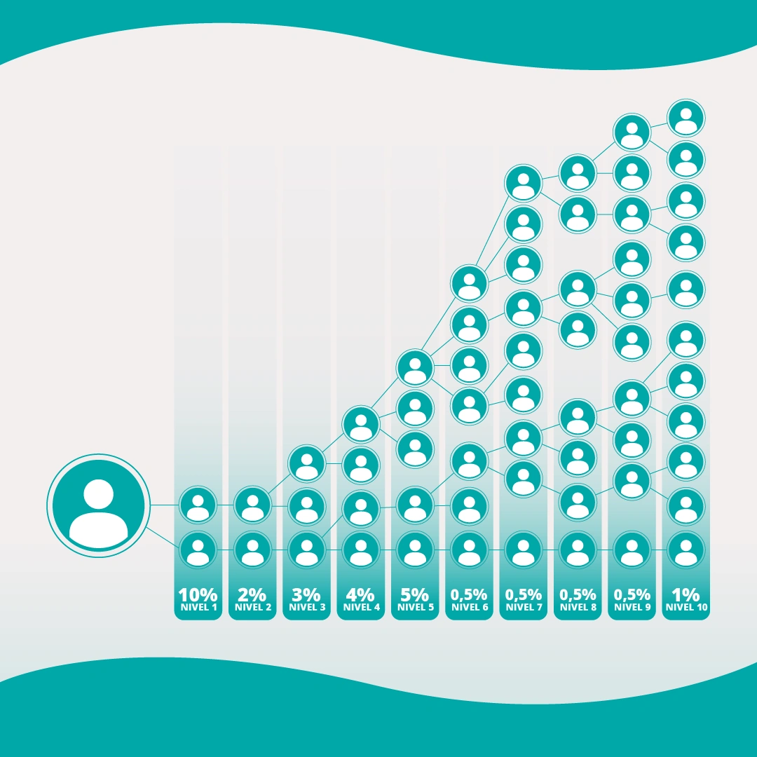 Si compras 2 productos y afilias al menos a 1 persona en el período de pago, o compras 4 productos al mes, obtienes regalías por todos tus afiliados en 10 niveles. Es el plan diseñado para quienes desean liderar, ayudar a otros a prosperar y escalar resultados a largo plazo.
